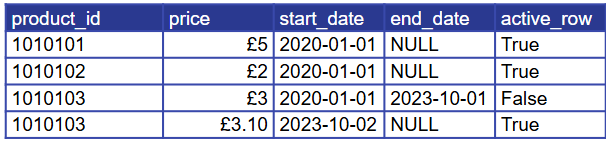 More than one row per dimension so requires care when joining. The start and end dates must always be used. Can be simplified with a current_row boolean.